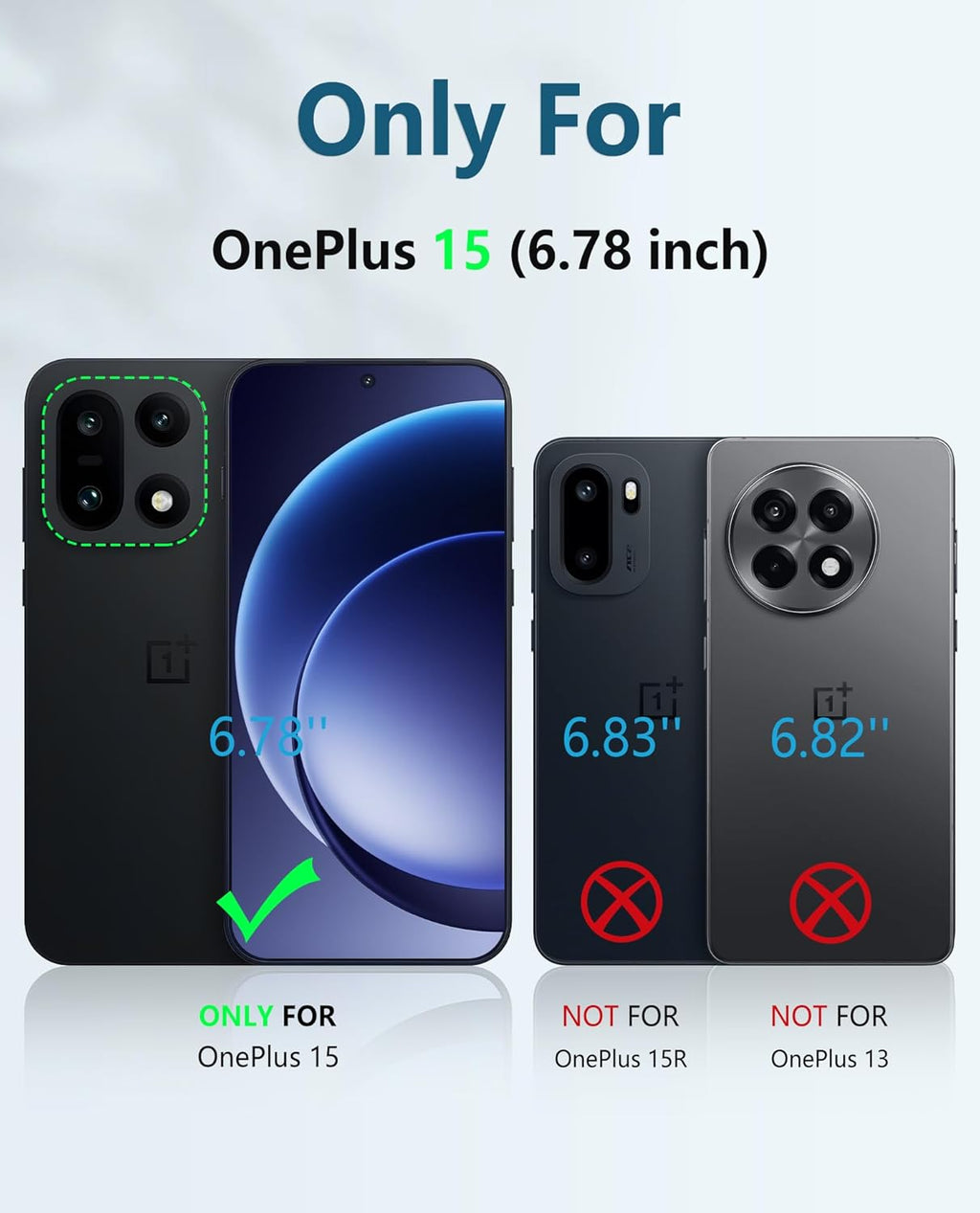 Q: Will this case fit OnePlus 15R or OnePlus 13? A: No—this case is precision-designed exclusively for OnePlus 15 6.78-inch. OnePlus 15R and OnePlus 13 have different dimensions, button positions, and camera arrays. Using wrong size results in misaligned cutouts, inaccessible buttons, loose fit, and compromised protection. Always verify exact model compatibility.