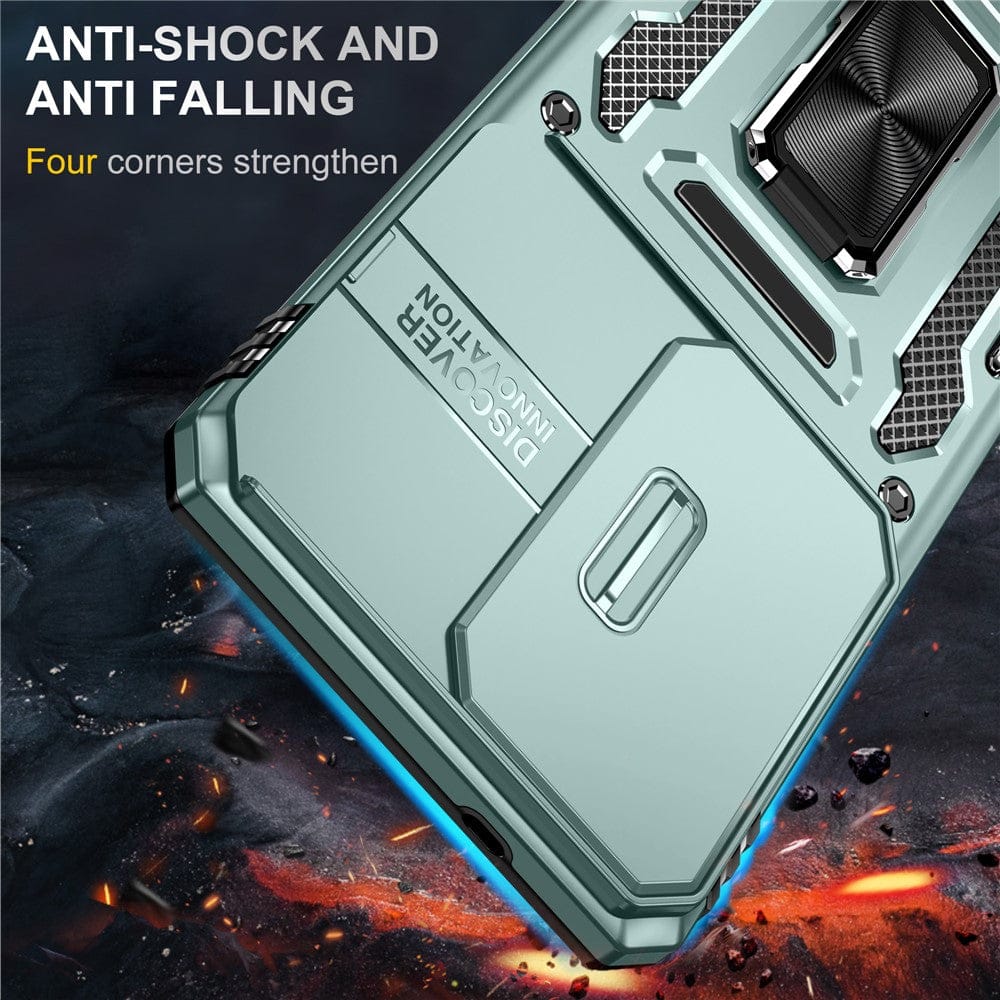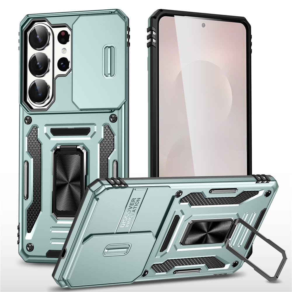 Main Image: Galaxy S26 Ultra in green case with ring stand – "Shockproof kickstand case for Samsung Galaxy S26 Ultra with camera slider"