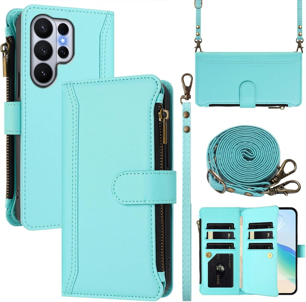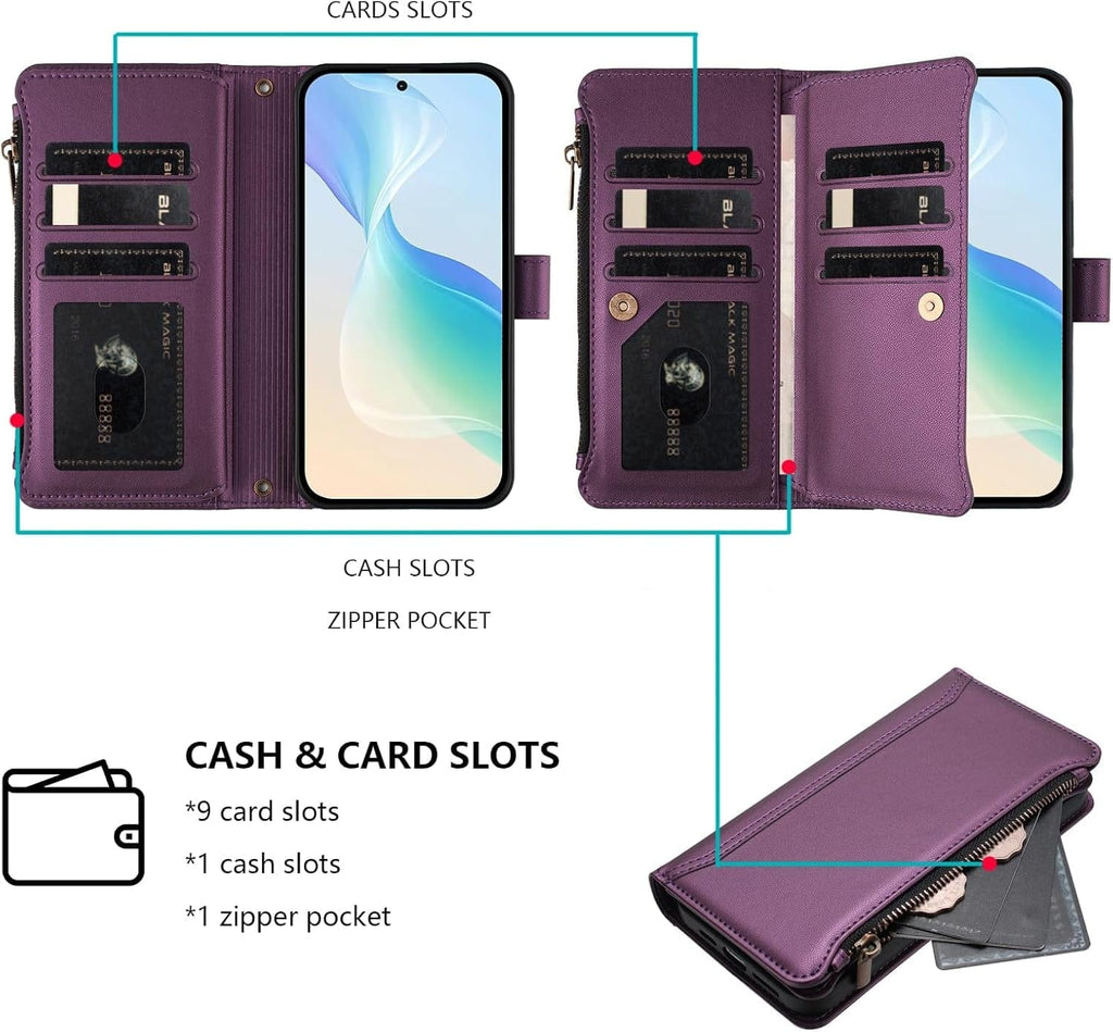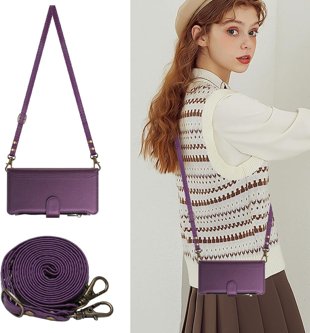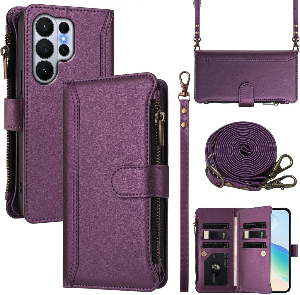 Carrying a phone and a wallet separately is an outdated system that costs you time, pocket space, and peace of mind every single day. This Galaxy S26 Ultra wallet case consolidates your phone, nine cards, cash, and hands-free carrying into one premium purple leather package with wireless charging compatibility and a magnetic kickstand. Two straps included — a long crossbody shoulder strap for hands-free carry and a short wrist strap for quick errands.