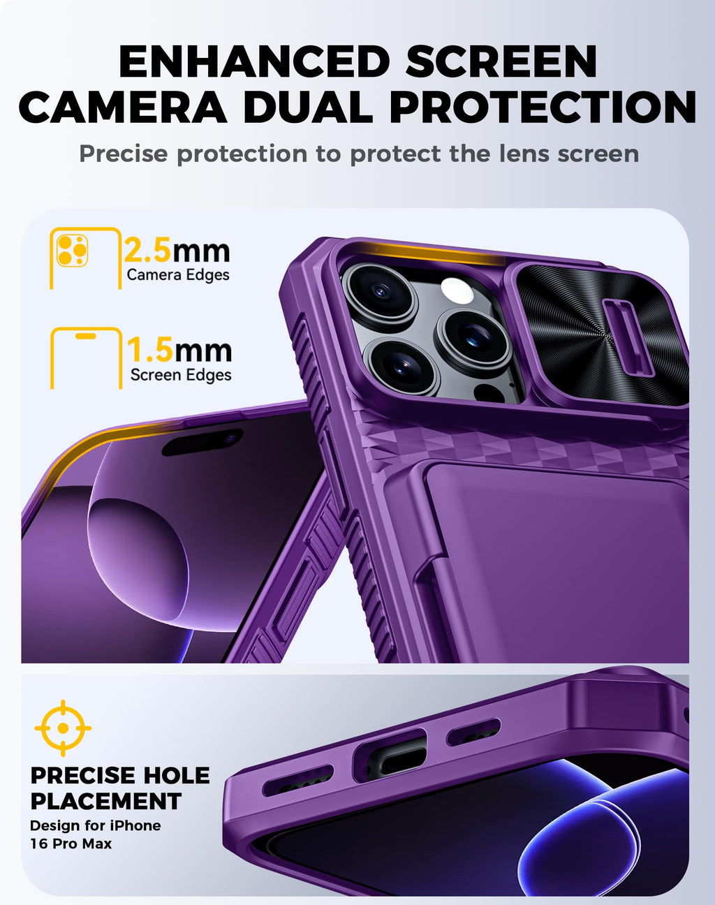 With military-grade protection built into a card-holding design, it lets you consolidate to a single accessory. The built-in RFID blocking shield defends your cards from unauthorized scanning. A sliding camera cover guards your lenses from scratches or dust. A reinforced camera control button ensures long-term usability. All edges are shock-absorbing silicone, corners reinforced, with raised bezels to protect glass and camera.
