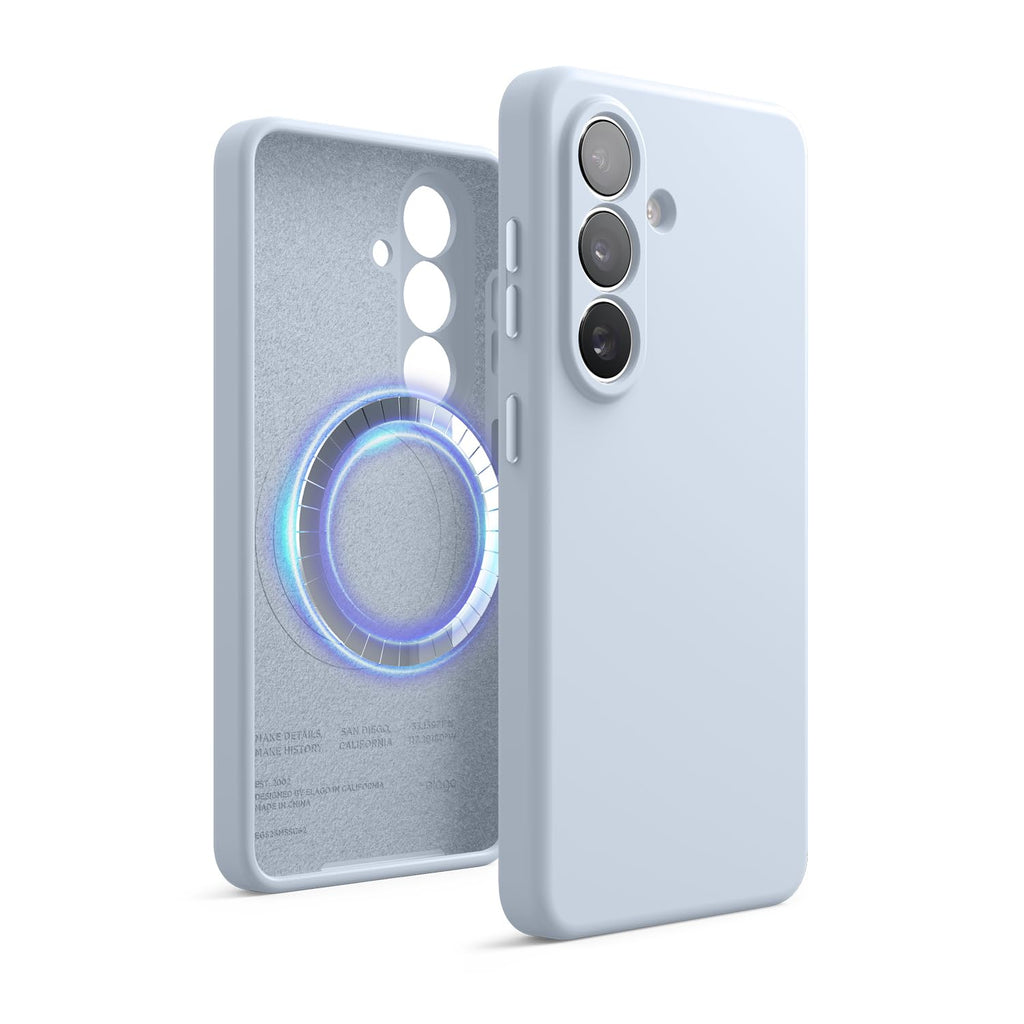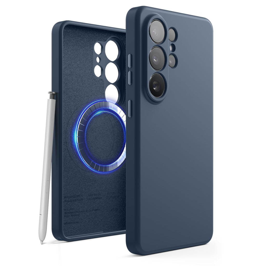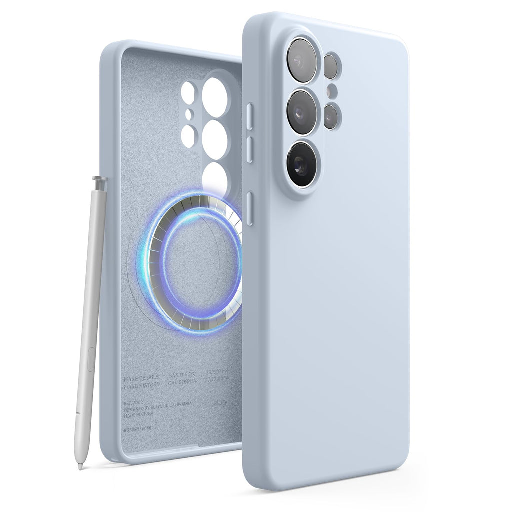 This case is constructed from premium silicone with a soft microfiber interior lining. It features integrated MagSafe-compatible magnets for wireless charging and accessory use. The shockproof design absorbs impacts while maintaining a slim profile. Anti-scratch interior coating protects the phone's finish. Available in seven colors including Jean Indigo, Lovely Pink, Stone, White, Medium Grey, Black, and Light Blue. Compatible with the Samsung Galaxy S26 Ultra.